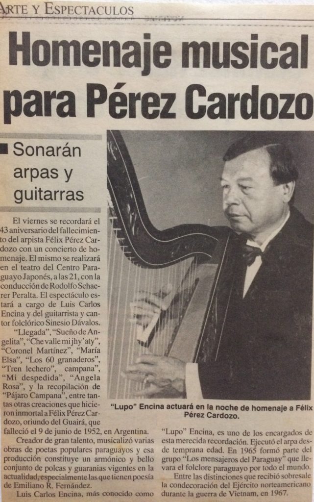 Lupo Encina; Homenaje Musical para Pérez Cardozo; publicación Diario Noticias Arte y Espectáculos.