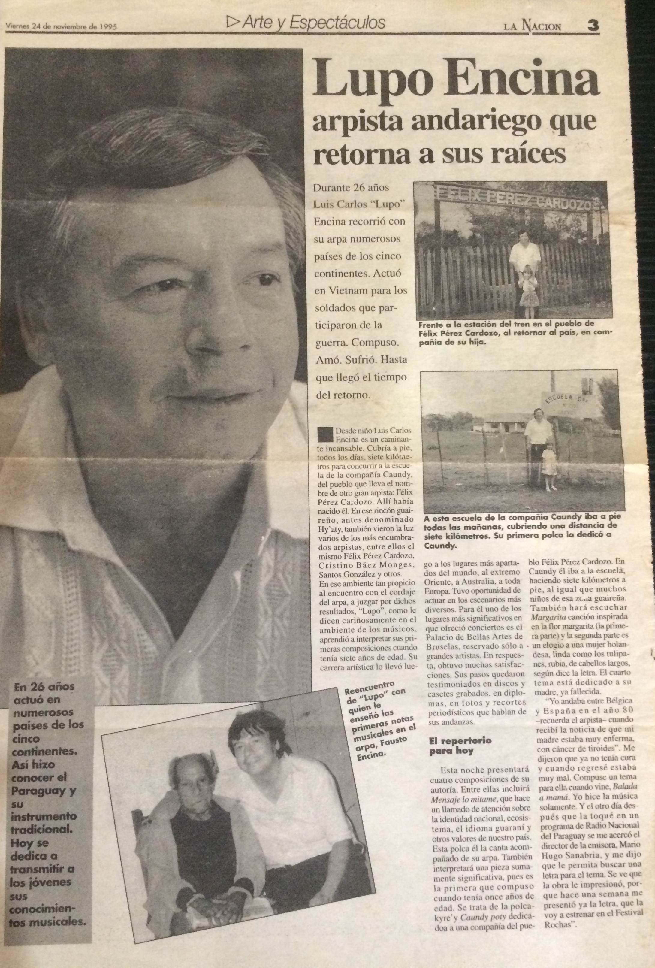 arpista andariego que retorna a sus raíces; publicación del Diario La Nación; 24 de setiembre de 1995.